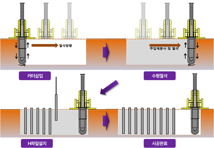 시멘트 또는 고화재를 물과 혼합한 시멘트 스페이스를 원지반토와 교반, 혼합하여 벽체형 연속벽체를 조성하는 공법이다.